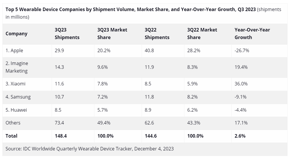 IDC報告2023Q3全球可穿戴設備市場:小米超過三星增長36%