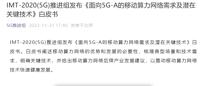 11月21日,據(jù)5G推進(jìn)組官微,IMT-2020(5G)推進(jìn)組發(fā)布《面向5G-A的移動(dòng)算力網(wǎng)絡(luò)需求及潛在關(guān)鍵技術(shù)》白皮書。白皮書總結(jié)了移動(dòng)算力網(wǎng)絡(luò)的十個(gè)關(guān)鍵技術(shù),包括超融合輕量化本地算力資源池化技術(shù)、算網(wǎng)統(tǒng)一資源調(diào)度及需求分解映射、算網(wǎng)體驗(yàn)QoS保障等。通過(guò)這些關(guān)鍵技術(shù),6G網(wǎng)絡(luò)可以做到輕量化算力資源管理,實(shí)現(xiàn)精確化、智能化算網(wǎng)業(yè)實(shí)時(shí)調(diào)度,用最節(jié)約的資源保障最大限度的用戶體驗(yàn)。