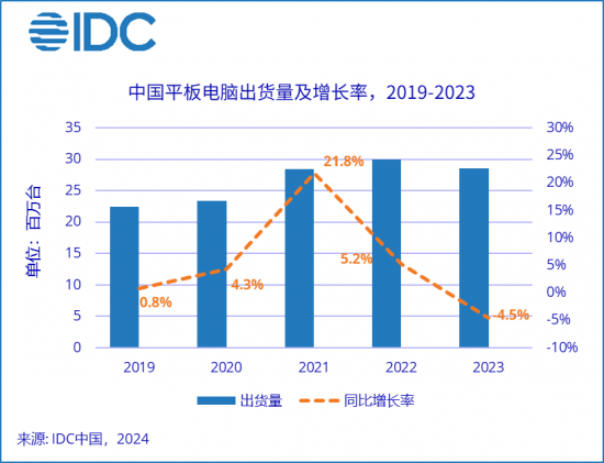 2023 年全年中國平板市場出貨量同比去年下降 4.5%,仍在經(jīng)歷連續(xù)上漲后的調(diào)整周期中。
