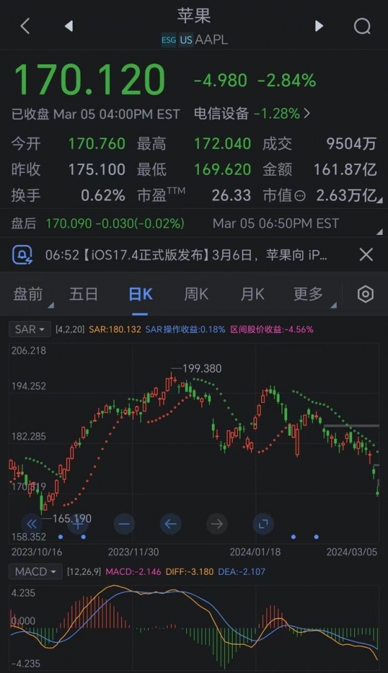 【劃重點】: 隔夜,蘋果、特斯拉繼續大幅回調,令美股大盤承壓 。蘋果收盤下跌2.84%,連續5個交易日下跌。消息面上,市場調研機構Counterpoint Research數據顯示,今年前六周,蘋果公司在中國的iPhone銷量同比