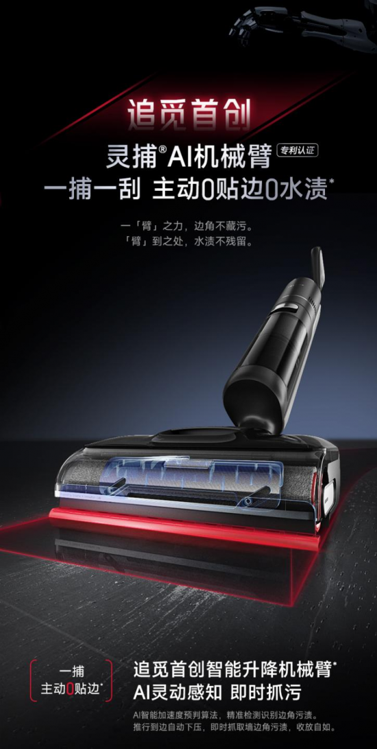 2024年9月,追覓推出了行業首創靈捕智能升降機械臂技術,成為行業首個真正實現0水漬殘留和三側0貼邊的技術方案,也是迄今為止行業最強的一項創新性技術之一,獲得了萊茵0水漬認證、綠創3側0貼邊雙項認證等多項權威機構認證。