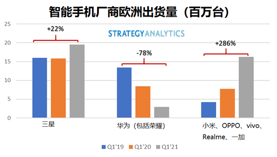 - 從2019年Q1到2021年Q1,小米、OPPO、vivo、Realme和一加智能手機在歐洲的出貨量增長了286%。未來他們能保持如此驚人的增長嗎? 中歐和東歐更加適合中國智能手機廠商的發展。這些