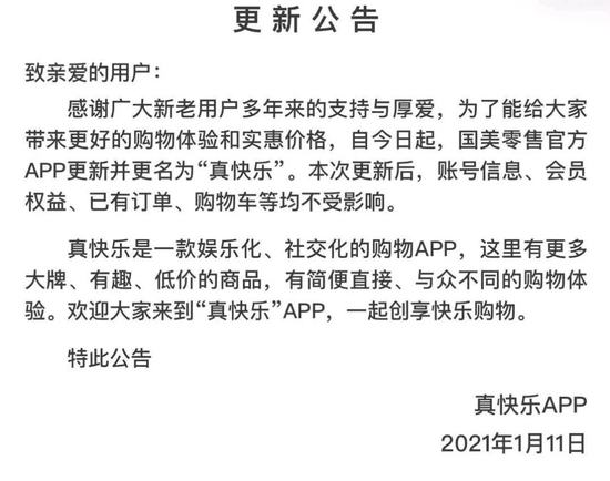 根據(jù)蘋果商店版本歷史記錄顯示,近期國美線上電商平臺“真快樂”app發(fā)布了新版本,除了常規(guī)的修復(fù)bug、優(yōu)化產(chǎn)品體驗之外,最大的改變是app名稱換回了“國美”,品牌色也從紫色換回了原logo標志性的正紅色。