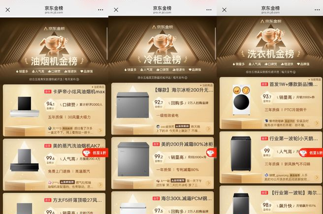 為了方便用戶購買,平臺還給出了榜單參考。比如天貓推出熱賣榜、新品榜,京東平臺推出熱賣榜、金榜,甚至各大平臺聚焦家電細分賽道,還推出了各個細分品類榜單,不僅直觀反映產品人氣,更是產品實力的真實體現。目前,天貓、京東、抖音三家的雙11榜單都已公布,綜合各品牌表現來看,海爾智家表現更為亮眼,在多個品類都拿下了TOP1。