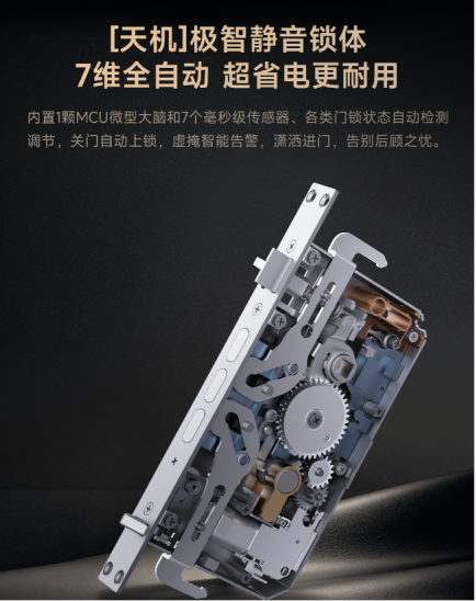 內置的7顆高精敏傳感器確保了鎖舌伸縮到位、門虛掩等狀態精準監測,它擁有7.2N.m大電機,力量十足,開關門都很有信心,最重要的是還可以省電50%,續航更持久。