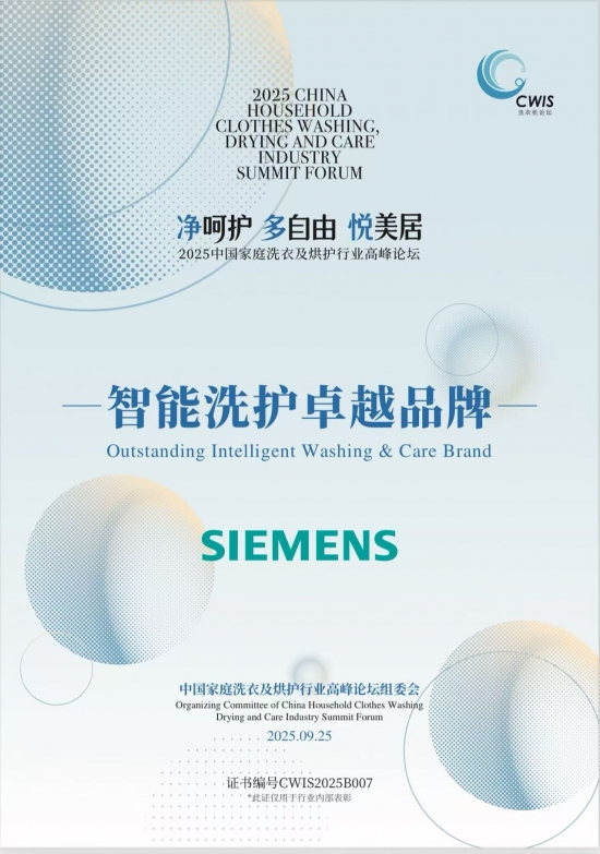 西門子家電榮獲“2025中國家庭洗衣及烘護行業智能洗護卓越品牌”